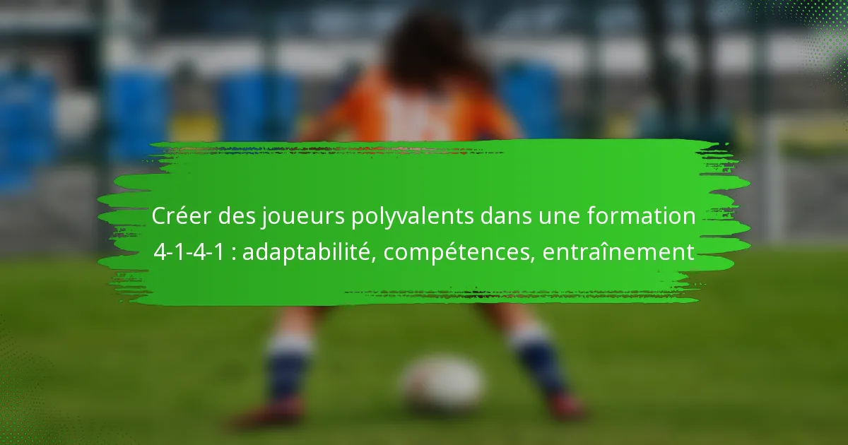 La formation 4-1-4-1 est un dispositif tactique au football qui équilibre la stabilité défensive avec des options offensives. Pour prospérer dans cette formation, les joueurs doivent développer un ensemble de compétences polyvalentes qui englobe de solides capacités défensives, la création de jeu au milieu de terrain et une puissance offensive. Un entraînement axé sur l’adaptabilité et la prise de conscience situationnelle est essentiel, permettant aux joueurs d’exceller dans divers rôles et de réagir efficacement à la nature dynamique des matchs.