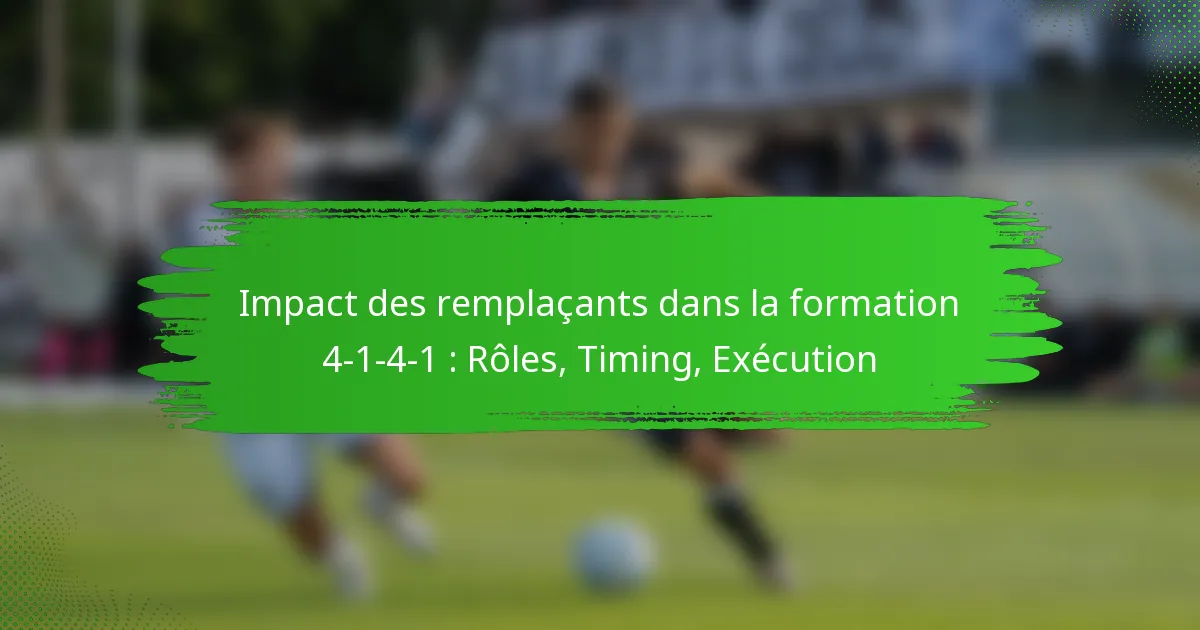 Les remplacements dans une formation 4-1-4-1 sont essentiels pour modifier la dynamique d’un match, car leurs rôles peuvent faire passer l’accent entre la défense, le contrôle du milieu de terrain et l’attaque. Le timing de ces substitutions est crucial ; des changements précoces peuvent injecter de l’énergie et des ajustements tactiques, tandis que des ajustements tardifs peuvent perturber la cohésion de l’équipe. Une exécution réussie repose sur une planification minutieuse avant le match et une adaptabilité en temps réel, ce qui peut grandement améliorer la performance et la réactivité d’une équipe pendant le jeu.